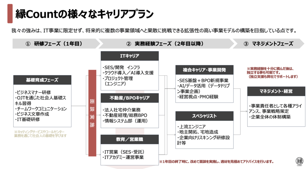 将来的には、プロジェクトマネージャーや事業責任者へのキャリアアップ も可能です。 さらに、縁countで経験を積んだ後、独立したいという夢も応援します(独立支援制度あり) 。
